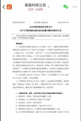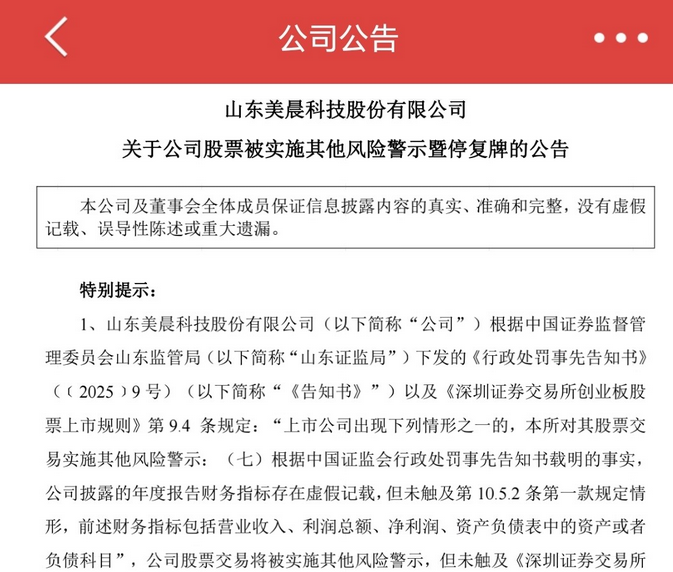 今天周六不开盘,一觉醒来,又一家公司因财务造假即将被ST。 上市公司美晨科技发布公告称,公司及相关当事人收到中国证券监督管理委员会山东监管局下发的《行政处罚事先告知书》,公司2014年至2018年年度报告存在虚假记载,公司通过其全资子公司杭州赛石园林集体有限公司实施财务造假,累计虚增收入14.38亿元,累计虚增利润6.58亿元。公司及相关责任人将面临警告和罚款的处罚,公司股票自2025年9月29日停牌一天,将于9月30日复牌,股票简称变更为“ST美晨”。 这个消息一出,股吧里一片哭声,公司股票白