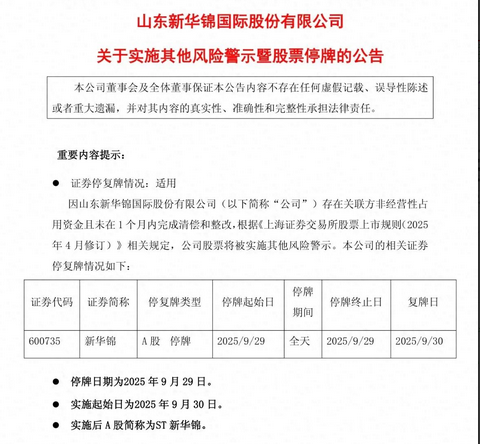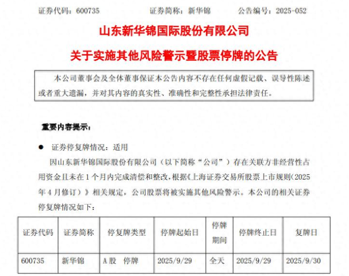 昨晚,上市公司新华锦,发布公告称,因公司存在被关联方非经营性占用资金4.06亿元,且未能在1个月内完成清偿和整改,根据相关规定,公司股票将被实施其他风险警示,将于下周一停牌一天,下周二复牌。复牌后,股票简称将由新华锦变更为“ST新华锦”,日涨跌幅限制变为5%! 消息一出,公司两万多股东,就集体破防了。有投资者留言评论说,新华锦账上的资金经常被关联方占用,貌似这已经不是第一次了,真的是恶心不该啊,坑了上市公司不说,股民也要跟着遭殃了;还有投资者留言说,公司股票前几天刚刚获得两个涨停,我还以为要强势