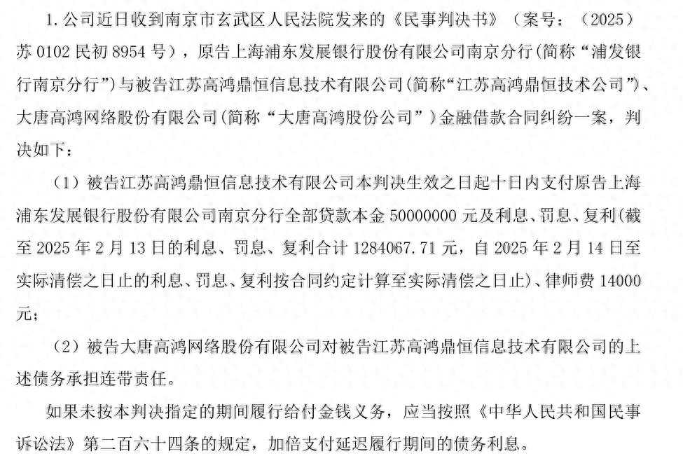 一家上市公司,诉讼金额竟然是净资产的近4倍!9月25日,*ST高鸿的一纸公告,揭开了这场债务危机的惊人规模。截至当日,公司及控股子公司累计诉讼、仲裁金额已达31.8亿元,相当于公司最近一期经审计合并报表净资产的386.9%。 这一数字,远超常规风险预警线,而银行相关纠纷正是这场风暴的核心。 浦发银行两起诉讼引爆危机 近日,浦发银行南京分行提起的两起诉讼获得一审判决。南京市玄武区人民法院判决要求江苏高鸿鼎恒信息技术有限公司在10日内支付5000万元本金及相应利息,江苏高鸿鼎远信息科技有限公司支付4