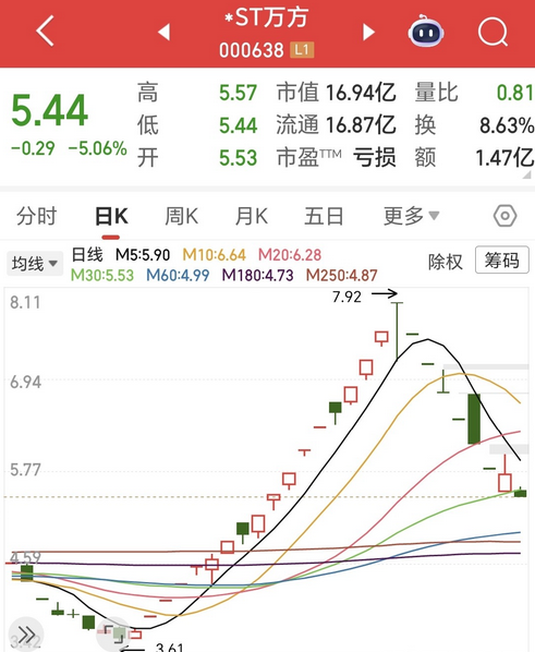 *ST万方这只股票应该是最近跌停吃得最多的股票了,该股自11月5日至11月14日的8个交易日内已经连遭7个跌停板了,股价跌幅已达30.4%,高位被套股民有的已被亏到睡不着觉。 *ST万方(万方发展),上市于1996年底,近20年的上市历程中股票长期被戴帽,已经是股市中的戴帽专业户了,今年4月30日起,因2024年度因各项财务数据不达标股票被实施退市风险警示,今年7月25日,因涉嫌信披违规公司被立案调查。 10月10日开始,因为外界传闻的一则公司控制权可能变更的消息,令*ST万方的股价突然反转上涨