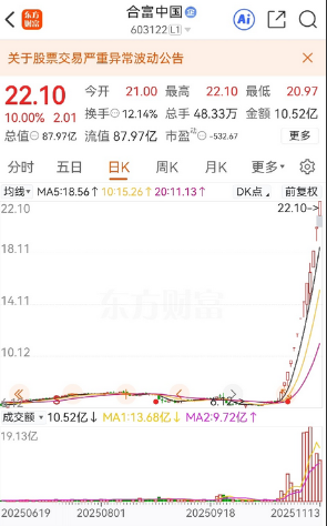 看了看,合富中国确实有点跨年妖的味道! 从6块多一路涨到了今天22.10块只用了不到半个月,资金把它炒成了妖股就三点原因:价格低、盘子小、筹码干净,到今天已经13天12板! 具体来说能这么妖,一是启动前股价才6块钱,主力也容易拉。想想看,10块钱以下的股票,涨到20块也不过翻一倍,心理压力小得多,这和平时低价囤货的心理是一样的。 二是流通市值起步才20多亿,主力资金不需要太大动静就能拉动股价。 三是筹码干净,散户不敢碰,这票之前横盘几年,业绩还亏损,散户早抛光了。结果反而成全了主力,没人抢筹码,