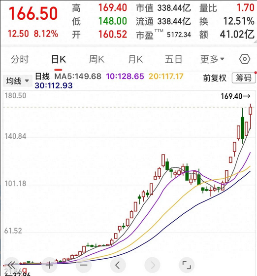 该股市盈率5172.34倍,这个的确有点高了,天地板后以为难解套,结果两天后又创新高,股票已经从10块涨到166.50,涨幅16倍。 目前行情不少投资者表示有点看不懂,因为炒预期的股票太多,而且它们大多是亏损股,对于喜欢价值投资的股民来说年涨十倍甚至更多,有点难以理解。 亏损股上涨或持续上涨就是因为投资者对公司未来发展充满期待,这些大涨的股票有的因为概念,有的因为重组,而有的没有原因也在跟涨,这种现象就是得到主力资金的关注。 今天这只市盈率5172倍的股票,走势也是让投资者看不懂,两天前该股盘中