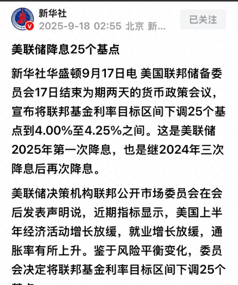 时隔十个月,美联储终于宣布降息了,美联储9月17号结束为期两天货币政策会议后,宣布将联邦基金利率目标区间下调25个基点到4.00%至4.25%之间。 这是美联储今年第一次降息,也是至高点5.25%至5.50%第四次降息,美联储2022年3月开启加息周期,通过11次加息把联邦基金利率加到了最高点5.50%。 2023年7月到2024月7月,美联储维持利率不变,2024年9月18日开始首次降息50个基点,11月7号降息25个基点,12月18号降息25个基点。 美联储利率最低的时候是2020年3月,当