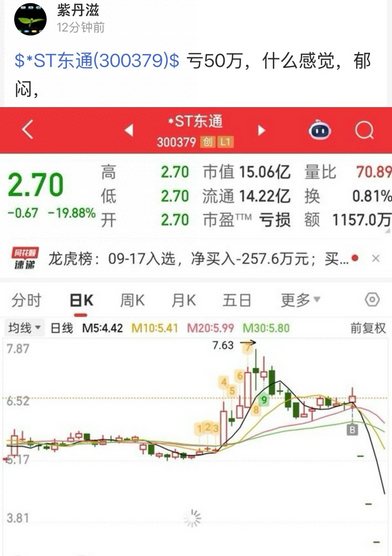 亏50万什么感觉?对于大多数投资者而言,亏50万会心痛,会郁闷,甚至会焦虑不安,因为要在股市赚50万是很难的,而且得需要不少本金。总之亏比赚容易,所以控制风险就很重要了。 一位买了st东通的投资者今天深深感悟到:四个跌停后亏了50万,亏麻了。他在该股一字跌停前一天买的,当天该股小幅上涨2.65%,是一轮小反弹调整后的上涨,所以有投资者认为是再次启动。 毕竟今年3月股价都还有21块多,四月立案调查后股价跌到了5元左右,五月被实施st其他风险警示,因为前期跌幅太多,就没有继续下跌,震荡到8月下旬上涨