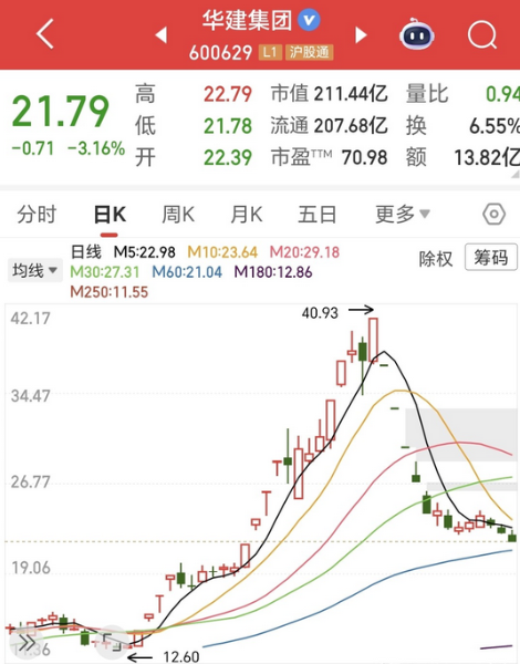 看到最终收入全天最低点的股价,这位抄底华建集团被套的安徽股民也是一脸的无奈,本想抄底博个反弹,这一进去却是抄在了半山腰,如今是越陷越深,越赔越多,已经不知道该如何是好了,与此同时,自10月15日至今半个月时间内进场买入该股的股民,也几乎没多少人能从中赚钱出来。 华建集团的核心业务是建筑工程设计咨询服务,自传闻公司将被借壳以来,其股价是一路狂飙,从年内的最低6.22元一路涨至10月21日的40.93元,除权后的股价更是创下该股上市以来的历史新高,区间最大涨幅达558%。 高企的股价早就严重偏离了公