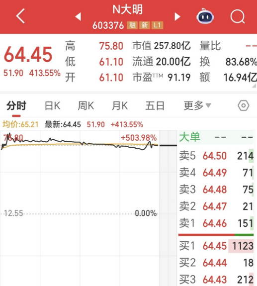 一个操作不好就是跳脚割肉,想通过炒股赚钱真的是有点难,有位股民也是个狠角色,一天之内又是重仓买新股,又是打板买已经拉了8个涨停板的股票,当天还是笑哈哈的赚到了一点,第二天就噎住再也笑不出来了。 这位股民11月6日以亏损9000元的代价割肉福石控股后,在开盘之际以开盘价61.10元买入该股6000股大明电子,投入本金36.7万元。 当天,发行价12.55元的大明电子在开盘后冲至最高75.80元,随后震荡下行至收盘的64.45元,收盘涨幅413.55%,这位股友在该股也获得了近2万元的盈利,浮盈幅度