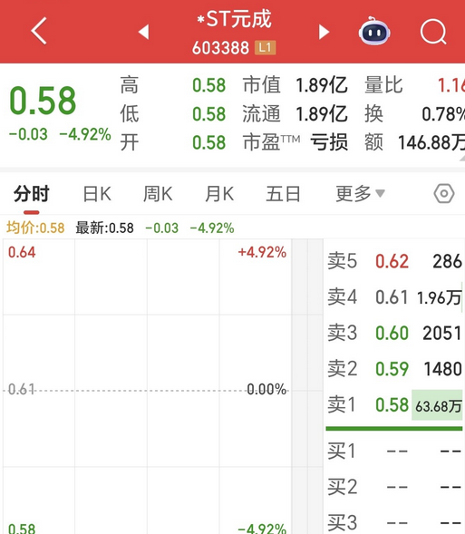 *ST元成,今天的股价收于0.58元,收盘市值1.89亿元,这已是该股连续20个交易日收盘市值低于5亿元,将触发市值退市的交易类强制退市程序,明起,该股将被停牌并进入退市程序,需要注意涉及交易类强制退市的股票没有退市整理期。 *ST元成,公司最近几年不仅营收连续下降,业绩也是累年亏损,2022年至今的净利润已累计亏损6.96亿元,经营状况每况愈下,今年5月6日起因各项财务指标不达标而被实施退市风险警示。 今年7月1日,公司及控股股东、实控人因涉嫌年报等定期报告财务数据虚假记载被立案调查,此后的股