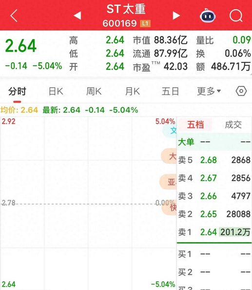 太原重工复牌一字跌停,七年年报虚假记载被st,跌停封单超200万