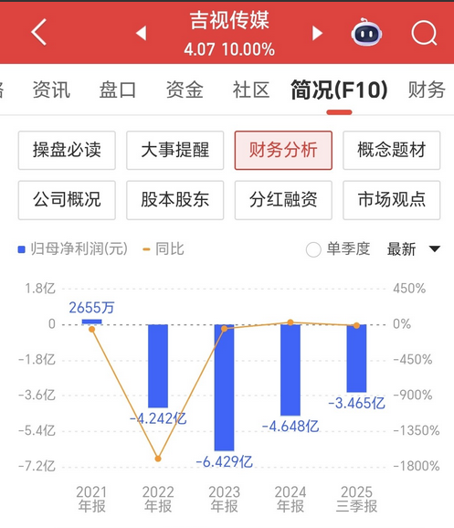 看着开盘后迅速垂直涨停于4.07元的股价,这位“抄底”吉视传媒被套后补至满仓无法动弹而硬扛一个半月的广东股民连想哭都找不到地方,因为手中的吉视传媒已经亏损近10万元才刚刚割肉,几乎已经被清仓,股价涨得再高也已和他没多大关系了,这也许就是没有能扛过至暗时刻,真正的倒在了黎明之前吧。 主要为客户提供智慧广电、数据服务业绩的吉视传媒,最近几年的营收虽然相对稳中有升,但业绩却处于持续亏损之中,公司2022年至今的净利润已累计亏损18.38亿元,今年三季报的亏损幅度相较于上年同期还扩大了11.92%。 表