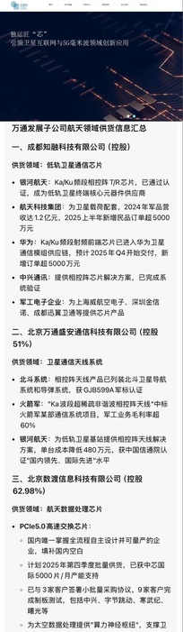 万通发展商业航天走芯片—天线—系统—算力全链路配套路线,聚焦低轨卫星通信与太空算力,2025年9月完成对数渡科技控股(62.98%),已形成空天通信+地面AI算力融合能力,核心客户含银河航天、航天科技集团等。 旗下3家控股公司参与商业航天业务 银河航天是中国商业低轨卫星互联网龙头,国内首家商业航天独角兽,核心是低轨通信卫星批量制造+星座组网+手机直连卫星,2025年营收预计18亿元+,量产与订单确定性强。 一、核心定位与基本信息 • 成立:2016年12月注册,2018年4月运营,创始人徐鸣,总