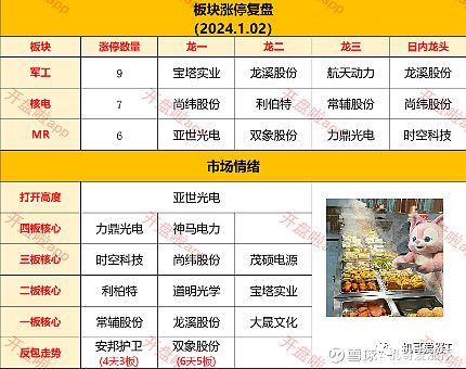 1.行情回顾 $亚世光电 继续涨停,来到了九连板 清源股份已经断板,光伏的狂欢开始了调整 今天军工核电比较强势,而且是新的题材,是可以继续关注的。 2.明日关注 军工板块:立航科技 核电板块:锡装股份 核污染板块:中晟高科 汽车板块:金麒麟 【gzh】后台回复【20240102】获取关注池 你好我是机哥,专注一进二雏龙战法 顺趋势,寻龙头 大道至简,量价为王。 专注一进二,学一招走天下。 多学多思多总结,少气少烦少抱怨。 每天坚持分享复盘策略,为大家提供思路和方向, 希望在打板的路上,都能做得越