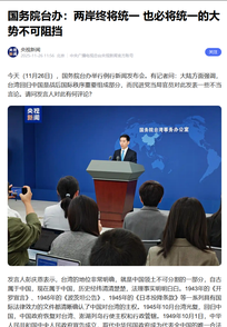 今天(11月26日),国务院台办举行例行新闻发布会。有记者问:大陆方面强调,台湾回归中国是战后国际秩序重要组成部分,而民进党当局官员对此发表一些不当言论。请问发言人对此有何评论? 发言人彭庆恩表示,台湾的地位非常明确,就是中国领土不可分割的一部分,自古属于中国,现在属于中国,历史经纬清清楚楚,法理事实明明白白。1943年的《开罗宣言》、1945年的《波茨坦公告》、1945年的《日本投降条款》等一系列具有国际法律效力的文件都清晰确认了中国对台湾的主权。1945年10月台湾光复,回归中国,中国政府恢
