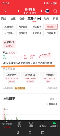 贵州轮胎000589军工装备+机器人概念。 9月3日阅兵倒计时22天-军工装备,贵州轮胎2019年国庆80周年阅兵,2017年建军90周年阅兵,2015年抗战胜利70周阅兵仪式上装配贵州轮胎的轮式车辆占比达80%以上。 贵州轮胎聚焦轮胎研发、生产及销售主营业务,重视信息化、智能化的应用,持续加大自动化设备的投入,包括胎圈成型机械手、全自动硫化机、硫化地沟巡检机器人、自动引导运输车等,力争实现轮胎生产工序全程自动化管理。基于此,2025年4月2日,同花顺给贵州轮胎新增了“机器人概念”。 同时,贵州