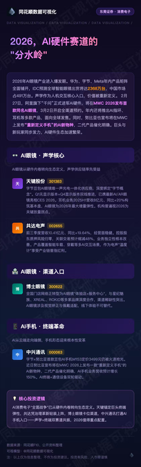 🔥【东莞证券消费电子】2026,AI硬件赛道的"分水岭"——AI眼镜AI手机产业链核心标 ⚡2026年AI眼镜产业进入爆发期。华为、字节跳动、Meta年内产品矩阵全面铺开,IDC预测全球智能眼镜出货量将突破2368万台,中国市场达491万台。声学作为人机交互的核心入口,价值被重新定义。 #天键股份(301383)——字节生态独家卡位 字节豆包AI眼镜唯一声光电一体化供应商,深度绑定"字节概念"。Q1无显示版本+Q4显示版本双线推进,公司已携最新AI/AR眼镜亮相CES 2026。耳机业务202