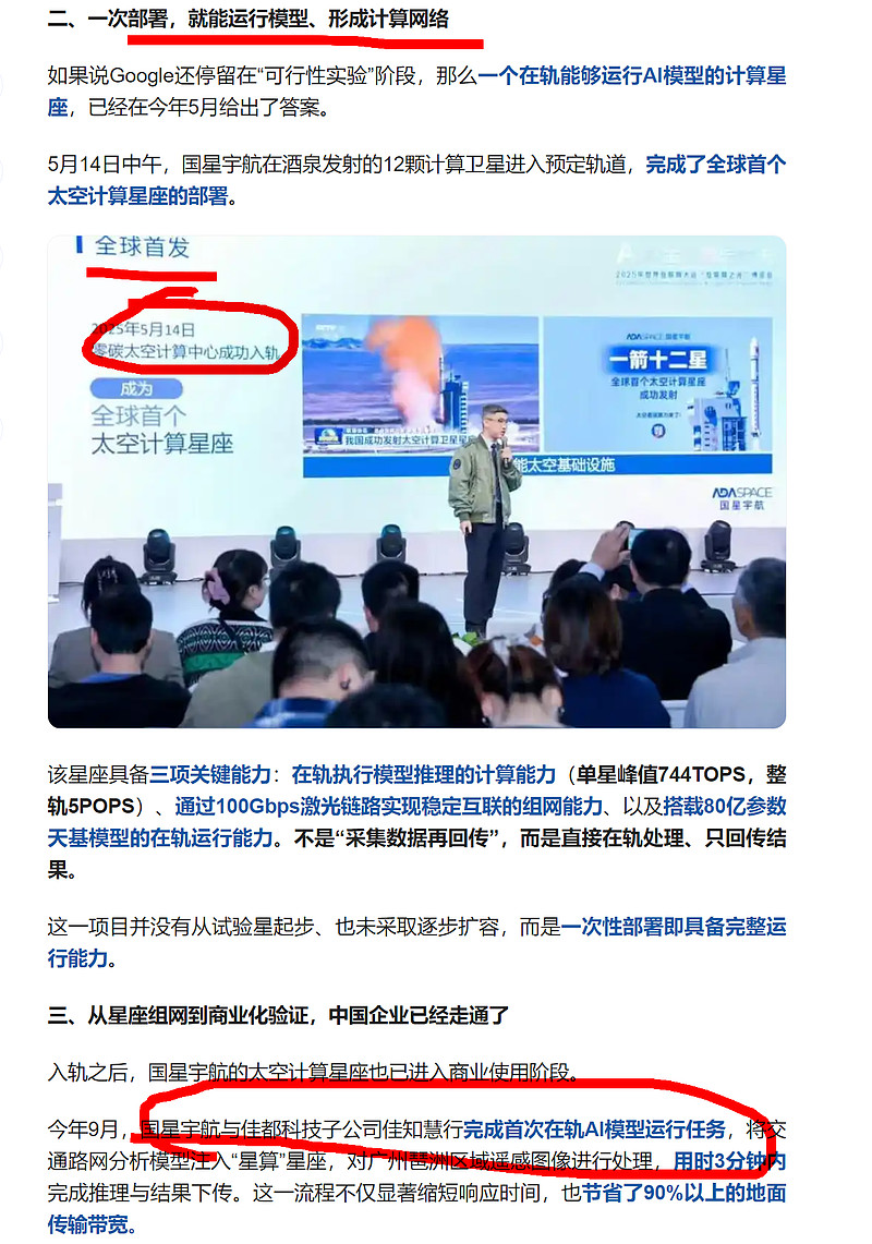 太空算力:谷歌刚发布计划 A股佳都科技旗下佳知慧行联合开展交通行业模型算法成功上星运行 太空算力竞赛白热化:谷歌刚刚发布计划,$佳都科技(SH600728)$ 中国太空计算卫星星座已在轨运行半年 国星宇航与A股AI公司佳都科技旗下佳知慧行联合开展交通行业模型算法成功上星运行,标志着零碳太空计算中心进入常态化商业运营 9月23日,国星宇航与A股AI公司佳都科技旗下佳知慧行联合开展交通行业模型算法成功上星运行,标志着零碳太空计算中心进入常态化商业运营 也已经为 之江实验室、中国科学院空天信息创新研究