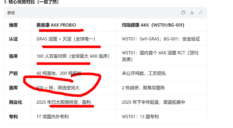 美诺华 JH389 引爆AKK 菌(瘦子菌)减肥赛道 善恩康 (倍加洁)最正宗 弹性最大 最受益 $美诺华(SH603538)$ 强势4连板 美诺华 JH389 临床数据落地,直接引爆AKK 菌(瘦子菌)减肥赛道, $倍加洁(SH603059)$ 善恩康(倍加洁),成为最受益标的之一 善恩康(倍加洁)中国AKK菌行业第一梯队为善恩康(倍加洁) 中国AKK菌行业竞争呈现原料端国产突围、制剂端代工集中、品牌端多元布局的格局,核心壁垒为菌株主权、厌氧工艺与合规认证,头部企业加速全链条整合,正从原料输出