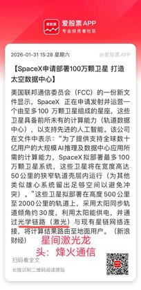 SpaceX百万卫星计划引爆太空算力,星间激光龙头烽火通信迎黄金风口 近日,SpaceX向FCC提交申请,计划部署至多100万颗具备计算能力的卫星打造太空数据中心,而这一计划的核心支撑,正是星间激光通信技术——作为卫星星座实现高速、低时延数据传输的“太空高速公路”,星间激光通信的行业需求被彻底引爆。而国内星间激光通信的绝对龙头烽火通信,凭借技术领先性、国产替代核心地位和业绩高增长,成为这一全球航天盛宴中最具确定性的受益标的。 SpaceX的百万卫星计划,本质上是全球低轨卫星星座和太空算力建设的标
