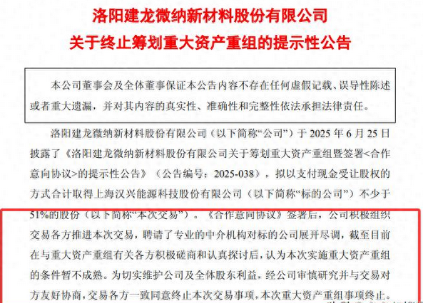 盘后,分子筛龙头建龙微纳发布公告称,公司原计划以支付现金受让股权的方式,收购上海汉兴能源科技股份有限公司不少于51%的股份,但经过与各方积极磋商和探讨后,认为实施该项重大资产重组的条件暂不成熟。经交易各方一致同意,决定终止本次交易事项。 消息一出,公司逾6000名股东里面就炸窝了。不少投资者纷纷留言说,酝酿了半年多,本以为是好事多磨,没想到是夜长梦多啊; 还有投资者说,未能重组成功,也未必就是坏事,你看梦天家居,也是重组失败,人家还走出了5连板呢;更是有投资者说,希望明天主力手下留情,不要下跌太