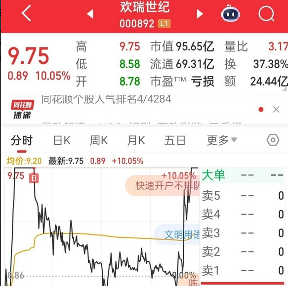 有人认为风浪越大鱼越贵,跟风打板追高标炒题材才能快速累积资金,这说起来容易,但在实际操作中可能就没那么轻松了,一个不小心就可能被挂在山顶吹嗖嗖凉风。 有位四川股民在11月26日同时满仓打板买入的2只股票筹码入手后就让他担惊受怕了一整天,但还是没逃过亏本赔钱的命运,今天更是领到一只跌停板,另一只又差点没跌停。 11月16日,这位四川股民以9.75元的成本价半仓买入已经连收3个涨停板的欢瑞世纪50600股,投入本金49.3万元,买入该股不久,其股价即炸板跳水,盘中的股价多次翻绿,好在尾盘再次快速拉升