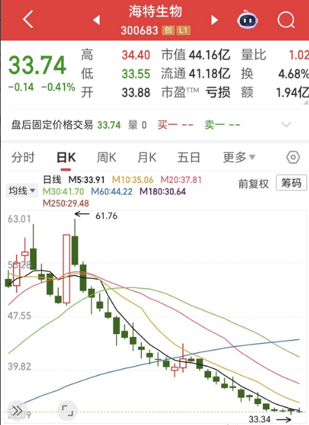 但凡炒股赔得惨的,可能看到这只股票的走势就不会那么难过了,连续一个多月来,海特生物的股价不是在跌就是在下跌的路上,跌到根本停不下来,场内持仓的1.64万散户早就被跌到麻木了。 不知道看到上图该股如此跌势,大家还有没有什么想说的,不过在看当前走势前先来回顾一下海特生物前期的涨势和基本面。 海特生物,公司主导产品是神经生长因子新药,不过公司的主要收入来源于对外的技术服务,占公司整体营收的49.47%。公司自2022年至今连续3年半期间的业绩累计亏损为2.43亿元,且有呈持续扩大之势。 该股的年内起涨