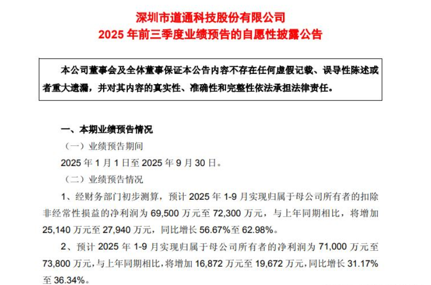 节后,A股就进入了三季报的披露期。今天收盘后,就有9家公司发布了三季报业绩预告。9家公司全部同比实现预增,其中增速最高达287%,果然敢于率先公布业绩的公司,都是优等生! 再回到今天盘面看,A股今天科技股普遍出现回调,沪深两市2448家下跌,跌幅超过5%的就有384家。而新成立的三季报业绩预增板块指数,却逆势大涨了3.44%!由此可见,三季报预增行情,或将是下一阶段的核心热点。 下面,我们就来盘点一下,这9家三季报业绩预增的公司,看看具体情况,到底怎么样。 第一家,道通科技 公司是一家计算机设备