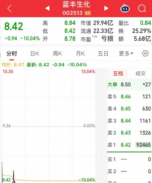 9天9板,前面的是涨停板,后面的是跌停板。今天三大指数进行了调整,创业板跌4.55%,前期涨幅较大的股票回落较多,但个股有近2800只上涨,下跌股票只有2530只,其中涨停股票70只,跌停股票10只。 这10只跌停股票中就有这只9天9板的股票蓝丰生化,该股之前已连续出现了7个涨停,昨天更是一字涨停开盘,因为盘面上感觉越走越强势,所以一字涨停后不少观望的投资者挂单去追了。 开盘三分钟后,这些挂单追涨停的都如愿以偿买到了,就是挂跌停都已经在账户里了,因为开盘三分钟后,该股直线下砸没有任何犹豫的砸到了