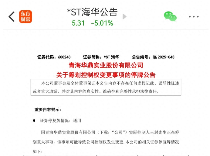 周末又一家公司筹划易主,准备停牌! 10月10日晚间,上市公司*ST海华发布公告称,公司实际控制人王封正在筹划重大事项,可能导致公司控制权发生变更,为保证公平信息披露,维护投资者利益,避免造成股价异常波动,公司股票将于2025年10月13日起停牌,预计停牌时间不超过2个交易日。 期间,公司将根据事项进展情况,严格按照有关法律法规的规定和要求履行信息披露义务。 *ST海华,原名青海华鼎,发行价4.55元,于2000年11月20日上市,所属行业为通用设备-其他通用设备,主营业务为齿轮、电梯配件等的研