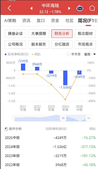 半个月的时间,中环海陆股价的跌幅最多时曾一度达到49%,如此巨大的跌幅堪比一只刚被ST的股票了,面对如此跌势,摆在该股持仓股民面的无非是含泪割肉,但不管选哪一条都是一个痛苦的过程。 是什么让一只股票在短时内出现如此跌势,原因要从多方面考量,短时涨幅过大,业绩连续亏损,都可能是诱因之一,但最重要的也许是前期公司控制权转让失利的后果所造成。 中环海陆上市于2021年8月3日,至今堪堪4年出头,上市后公司的营收和业绩即连年持续下滑,2023年至今的连续2年半期间,公司净利润累计亏损2.28亿元。 公司