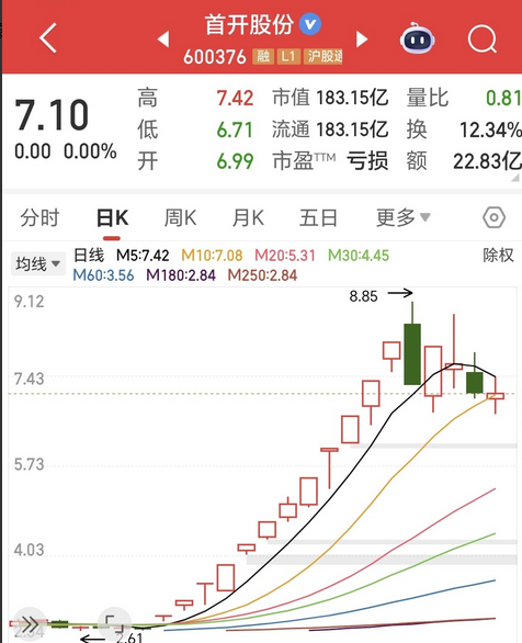 又到一天收盘时,沪指全天均在零轴线上下震荡选择方向,最终于微绿收盘,近3877只个股待涨,红盘个股仅1477只,大多数股民又是赔钱的一天。 首开股份,因为旗下子公司间接投资宇树科技约0.3%的股份前期被一番爆炒,在9月3日至9月22日的14个交易日录得12个涨停板,股价也是从起涨前的2.64元涨至最高8.85元,区间最大涨幅达235.23%,一举创下该股最近6年来的新高。 9月23日,该股低开并迅速跌停于7.19元,早盘临休市前撬板成功并持续拉高,最高涨至接近涨停价的8.60元,差点整出个地天板