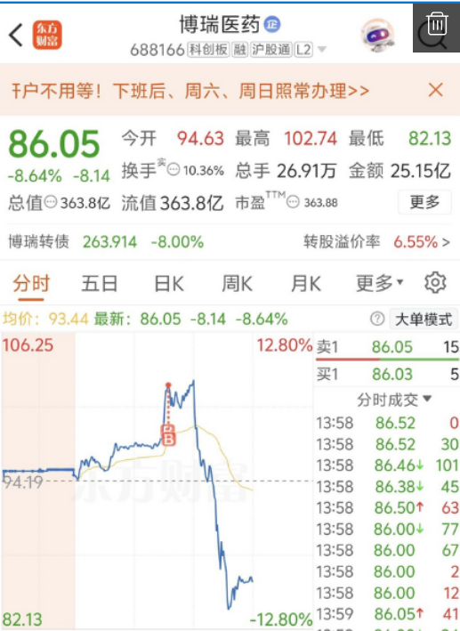 看到收盘再次大跌超12%的股价,有持仓博瑞医药的股民大呼:“求你别跌了”! 究竟是什么让他如此失态?先来看博瑞医药的股价,9月22日,该股早盘的股价在相关概念板块出现调整的情况下,其特立独行的高开高走,最高涨至102.74元,最大涨幅9.08%,这位股民在第一波的高点连续2次买的该股,几乎就买在了该股的全天最高点。 然而下午开盘后博瑞医药的股价就直接闪崩跳水最终收跌于81.80元,收盘跌幅达13.15%,最高位买入的股民将承受该股日内最大20.38%的浮亏幅度,然而这也仅只是开胃菜而已。 9月2