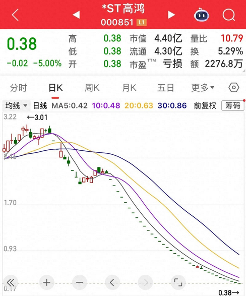 本想抄底博反弹,不料却让自己直接掉坑里了,连挨9个跌停板后最终付出亏损6.7万元的代价艰难割肉出来,这种酸爽的感觉想必这位四川股民肯定不会再愿意去品尝第二次了。 *ST高鸿自8月8日披露前期因涉嫌信披违规被立案调查的结果,经查明公司在2015年至2023年连续9年期间的财务报告存在虚假记载,公司可能触及重大重大违法强制退市情形,股票有被强制退市的风险。 暴此大雷后,*ST高鸿的股价自8日11日至9月25日期间的34个交易日内整整遭受了33个跌停板,今日收盘价为0.40元,相较于暴雷前的2.21元