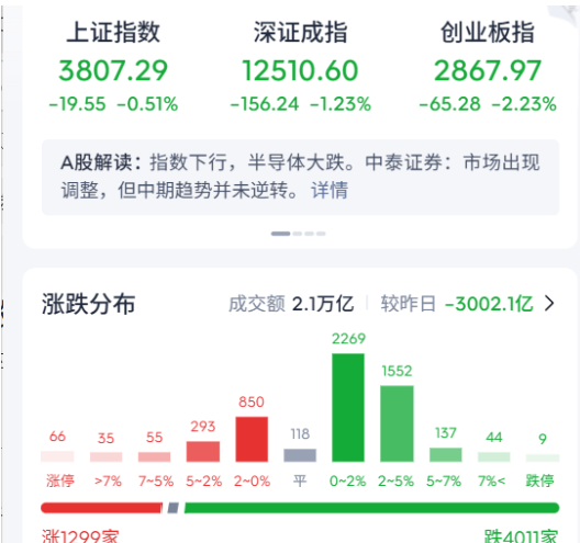 我昨天就说过了,总感觉牛有点累了,现在就像是在村口等情郎的大姑娘一样:既怕他不来,又怕他乱来~ 或许他会来,但一定要做好他乱来的准备,操作上务必保持一些谨慎,争取上个月红的这个月还没过半就吐回去了。 今天三大指数全天震荡下行,截至收盘,沪指跌0.51%,深证成指跌1.23%,创业板指跌2.23%。两市个股超4000只待涨。题材概念轮动完就多数下行,涨跌中位数为-1.18%,今天散户亏傻了都。 正如我所说的那样,今天大A就纯纯乱来:指数全绿,个股普跌,关键是大幅缩量,很麻烦。原本作为村里希望的半导