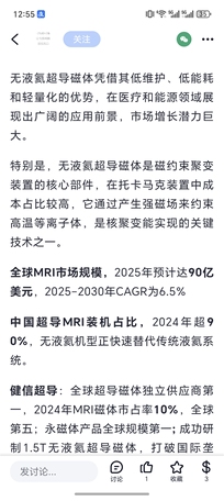 无液氦超导磁体的核心价值是摆脱液氦依赖,降低制冷成本与维护难度,同时保障超导磁体的稳定运行,广泛应用于医疗、科研、工业等领域。 1. 医疗领域:用于核磁共振成像(MRI)设备,无需频繁补充液氦,降低医院的设备运维成本,让基层医疗机构更易普及高端影像检查。 2. 科研领域:支撑可控核聚变、粒子加速器、量子计算等前沿研究,在强磁场环境下实现对微观粒子、材料特性的精准观测,且设备部署更灵活。 3. 工业领域:应用于超导电机、超导储能系统、磁悬浮列车等,提升设备能效与功率密度,助力新能源、高端装备制造等