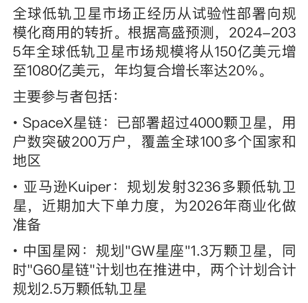 信维通信作为卫星互联网产业链的重要参与者,在7月27日我国成功发射卫星互联网低轨05组卫星项目中展现出显著的技术实力与产业价值。公司通过地面终端核心部件供应深度融入产业链,在国际市场占据高端连接器和天线的主导地位,同时在国内市场通过技术认证和客户合作蓄势待发。2025年卫星业务总收入预计达15-20亿元,占公司营收比重提升至12%-15%,成为第二增长曲线的核心驱动力。随着中国星网"GW星座"1.3万颗卫星组网计划加速推进,信维通信有望在千亿级市场中持续受益,技术壁垒构建的护城河将推动整体毛利率