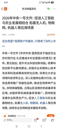 2026年农业1号文件在今天晚上这个时间发布,这个文件引申出来的人工智能农业,AI农业这个新题材,卡着当下这个情绪节点,值得各位老师注意,通过之前蓝色光标,天龙集团和利欧这些股票马上过之前高点的走势来看,AI应用这个题材到过年之前,有很多资金对这一块还是有强烈的预期在的。 人工智能如何结合农业开展工作,就以托普云农小程序上面的工作内容结合举例 2026年中央一号文件对托普云农(301556)构成多重实质性利好,主要体现在政策导向、产业支持、项目落地和市场预期四个维度。以下是具体分析: 一、政策高