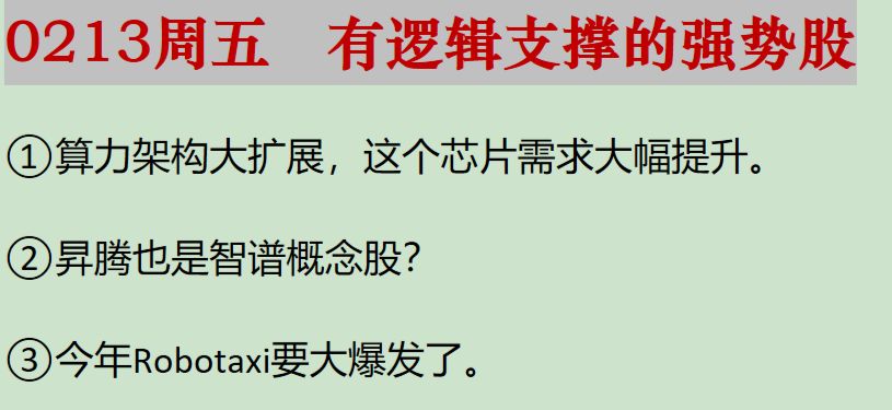 02/13周五复盘概要 以下是大涨公司深度复盘,相关信息仅供参考。 ①交换芯片:AI算力集群向Scale-up架构演进,推高交换芯片用量,国产化率很低。这家公司拥有交换芯片全栈能力,产品带宽对标国际一流,高端芯片攻入算力互联核心领域。 ②华为昇腾:智谱新模型在昇腾实现高效部署,超节点指标超越海外产品,昇腾CANN架构全面开源,致力成为全球AI算力第二选择,今年开始将成为爆发关键节点。 ③无人驾驶:工信部制修订智驾安全国标,支付宝上线Robotaxi打车小程序,这家公司引入豪华股东与核心管理团队,