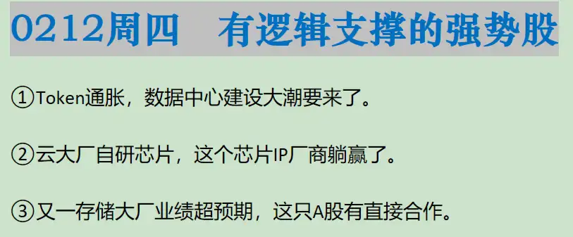 02/12周四复盘概要 以下是大涨公司深度复盘,相关信息仅供参考。 ①云计算数据中心:智谱上调产品价格,字节将推豆包2.0,国产AI迎来超密集催化。云厂商新一轮智算中心布局在即,IDC向AIDC升级,2028年国内智算中心市场规模预计达2886亿。 ②芯片设计:国内头部云厂加速自研ASIC产品,这家公司拥有全制程设计能力,IP储备丰富,头部客户众多,AI算力相关新订单占比超84%。 ③服务器存储:日本铠侠业绩再度大超预期,叠加AI需求高增,这家公司业务全覆盖,布局算力租赁、存储全链条及服务器再制