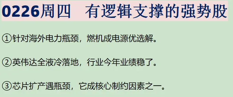 02/26周四复盘概要 以下是大涨公司深度复盘,相关信息仅供参考。 ①燃气轮机:高盛上调全球数据中心用电需求增幅,燃气轮机因适配性成AIDC主电源优选。行业供需错配,这家公司自研重型燃机实现商业化,毛利率大幅提升,同时抽蓄、风电业务也迎来增长机遇。 ②液冷:英伟达展示首款全液冷系统,头部厂商订单已拉长至2028年。大陆龙头在ASIC液冷布局未落后,凭借全链条能力有望实现海外突破,此外单相冷板式仍将是未来几年主流方案。 ③洁净室:芯片厂商扩产受洁净室空间限制,阿斯麦、台积电等均遇产能瓶颈,随着洁净