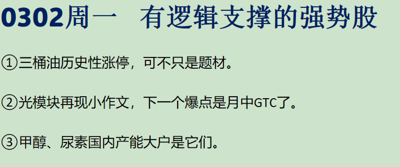 03/02周一复盘概要 以下是大涨公司深度复盘,相关信息仅供参考。 ①油服:中东冲突致霍尔木兹海峡航运受限,该线路此前石油流量占全球海运石油贸易总量的四分之一以上,国内方面,三桶油高资本开支+油服企业海外业务业绩释放,上游勘探设备、水下设备等多细分赛道将受影响,龙头央企还有望实现穿越油价周期。 ②光通信:英伟达GTC大会将发布新款芯片及CPO相关方案,华为也展出全新超节点产品,叠加光模块订单传闻催化板块行情。随着分布式算力催生DCI网络强需求,光交换技术替代电交换成趋势,这家公司已在多个领域布局