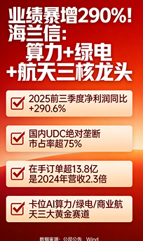 炸裂!业绩暴增290%+三大黄金赛道垄断!海兰信:被严重低估的算力+航天双料总龙头,主升浪刚启动! 当下的A股,最不缺的是题材故事,最稀缺的是「赛道够硬+业绩兑现+壁垒够深」的真龙头。AI算力、绿色电力、商业航天,三大万亿级国家战略主线,随便踩中一个都能走出翻倍行情,而有一家公司,同时集齐了三大主线的核心卡位,还手握国资控股背书、2025年业绩近3倍暴涨,却仍被市场严重低估——它就是海兰信。 一、业绩是最好的试金石!翻倍增长绝非昙花一现,订单储备锁定3年高增长 市场永远为确定性买单,海兰信的业绩