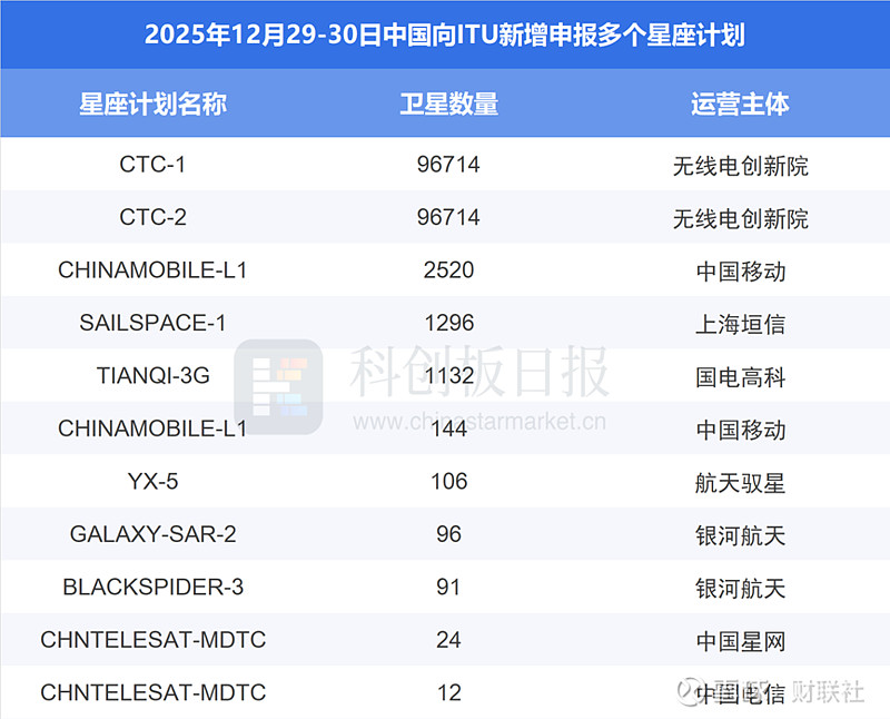 《科创板日报》1月10日讯全球太空资源竞争正在加速 。 据国际电信联盟(ITU)官网显示,2025年最后一周,我国向ITU申报了多个卫星星座计划,申报总规模超20万颗。 本次卫星频谱轨申报运营主体全面扩容,涉及中国星网、上海垣信、中国移动、中国电信、无线电频谱开发利用和技术创新研究院(无线电创新院)、国电高科、航天驭星、银河航天等多家公司机构。 其中,规模最大的两个星座为无线电创新院CTC-1和CTC-2,卫星规模均为96714颗。 公开信息显示,无线电创新院于2025年12月30日在雄安新区登