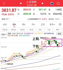 三线(5.10.20)即将交汇!注意短线即将变盘! 今天大盘最高点刚好是打到10日线(3833),上下压力支撑都比较明确,上有5,10日线压力,下有20日线作为支撑参考,尾盘虽站上5日线,但还需要考验。 这个位置的关键,就是三线即将交汇粘合,就会迫使大盘被迫选择方向,要么站上所有均线,再去挑战前高压力3888,要么跌破20日线,再向下考验一次下轨支撑,目前刚好处于一个中轨附近,可上可下。没有跌破20日线之前,观望为主,就看大盘做何选择,做好应对即可。 明天开盘15分钟宜定多空!