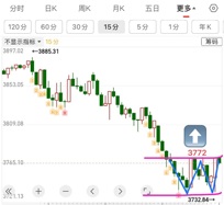 三个交易日跌了150点,先跌个股再跌指数,等你反应过来了,指数已经下来了,所以很能理解大部分投资者的情绪,恐慌!也确实个股的调整幅度还是比较大的,而且是那种无差别下杀,不管是有没有涨的,先调整再说,尤其是仓位比较重的,杀伤力还是有的。 大盘观点:上证指数整体结构还是看震荡,只不过从上轨下来空头的速度力度还是比较大的,所以目前还没有看到止跌的迹象;15分钟的走势,如图1在构建小级别中枢,这里的走势有两种分类:1.反弹需站稳3772,压力3800附近或5日线(3885调整的半分位3809,),这里的
