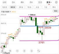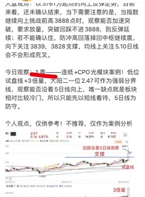 重要时刻!倒计时! 昨晚美股是下跌的,不过好在富时A50以及中概股是红的,对今天开盘的影响就会相对有限,这个位置最怕的就是大幅度低开留下缺口,目前来看昨天个股先调整,今天应该会好一些,不过要看修复的力度来综合判断,毕竟指标还是有瑕疵的,比如60.120分钟macd 没有形成金叉,反而向下转弯,所以今天修复的力度还是比较重要的。 需要注意的就是,技术面,如果向上,看3888能否真突破,向下看3828支撑或5.10日线会不会形成死叉,具体走势分类可以看昨晚收评,根据走势分类做好应对。 为了让大家更好
