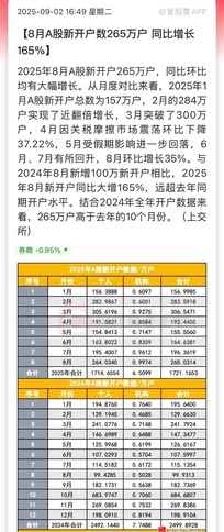 8月A股新开户数265万户,同比+165%,环比+35%。8月指数可是狂非常强,新韭菜也在跑步入市,这可以给牛市助力啊! 不过,现在市场氛围还没有今年2、3月狂热,跟去年10月(新增600多万)差距就更大。所以大家不用慌,现在市场还没有过热,新jc根本没怎么进来呢。 这一轮行情,主要还是机构+两融+大户搞的。8月机构开户达到了0.99万户,超过了去年10月(0.7万户);而8月新增散户,明显没有进入疯狂状态!从这个角度看,这波行情还有相当的空间,因为散户尚未疯狂,而机构正在持续进场。#a股震荡调