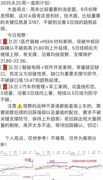 2025.8.26盘前计划: 大盘观点:5日线有一定的乖离,且指标开口过大,今日大概率会做震荡,小k线结构或十字星类似,短线看缺口支撑3844附近,不破还可以延续强势震荡。 今日观察: [🧧]1.网络安全+软件开发案例!放量突破中枢箱体,今日小幅回踩收小k线,5日线有一定的乖离,明日大概率还会回踩,支撑113.8,防守不破。 [🧧]2.卫星导航+商业航天案例!试盘线+3倍量,股价过前高,沿着5日线向上观察,短线以5日线为防守即可。 [🧧]次新+充电模块案例!突破前期高点,放量大阳,可作为标