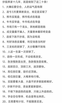 据说是“炒股养家”的20条心法分享,算得上是干货满满了,值得大家细细品味一下。 别的不说,第8条“利好消息反着看,利空消息当利好”这条实在是太对了!股市真的是反人性的,要有逆向思维。 这点真的深有体会,往往买的股票,下午利好消息一出来,一看开心的不行,满怀着期待,结果第二天要么大幅低开,要么高开低走,绿的发光,令人大失所望。#a股# #财经之星# #优质博文上热搜开放计划#