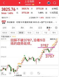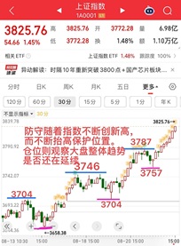 上升趋势不看压力,更看支撑! 只要上升趋势还在,中线的仓位基本上不会去乱动,我个人不是那种比较极端的,动不动就清仓或者满仓,这样肯定不行,都很容易影响心态。 一般来说,沿着大盘的趋势在走,只要不跌破防守保护位,比如现在的3757,如图所示,不断抬高防守保护位置,不破则中线的底仓是可以不动的。举个例子,比如手里的中线仓位4或5个,只要趋势一直向上走,就可以继续保持,再利用剩下的部分仓位作为灵动仓位,去做高抛或低吸,又或者寻求其他个股机会,这个部分仓位可以是灵活的。 还有就是,尽量不要开超市,手里个