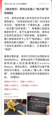 周末英伟达的催化很多。 第一、英伟达机器人大脑今天发布。这是专为物理AI和人形机器人打造,看有多大的惊喜了! 第二、英伟达推出Spectrum-XGS以太网。主要利好高速光模块、 CPO、是算力概念的方向的延续。 第三、英伟达新款AI芯片入华。英伟达暂停H20芯片,也是准备给新的“特供芯片”让路。 第四、英伟达8月27日发布财报,业绩超预期可能性挺大的。 之前A股一直炒海外算力,易中天、工业富联等,最近猛炒国产替代、寒武纪、海光信息、中芯国际等等!比较看好国产,但海外算力业绩,不会那么快熄火的。