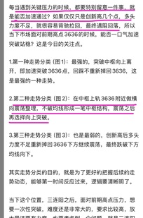 每当遇到关键压力的时候,都要特别留意一件事,就是能否加速通过?如果仅仅只是创新高几个点,多头力度不足,就很容易背驰拉回,最终遇阻回落,所以当下市场面对前期高点3636的时候,能否一口气加速突破站稳?这是今日的关注点。 1.第一种走势分类(图1):最强的,突破中枢向上离开,即加速突破3636点,回踩不重新掉回3636,这是最强的一种走势。 2.第二种走势分类(图2):在中枢上轨3636附近做横向震荡整理,不破均线形成一笔中枢结构,震荡之后再选择向上突破。 3.第三种走势分类(图3):也是最弱的,创